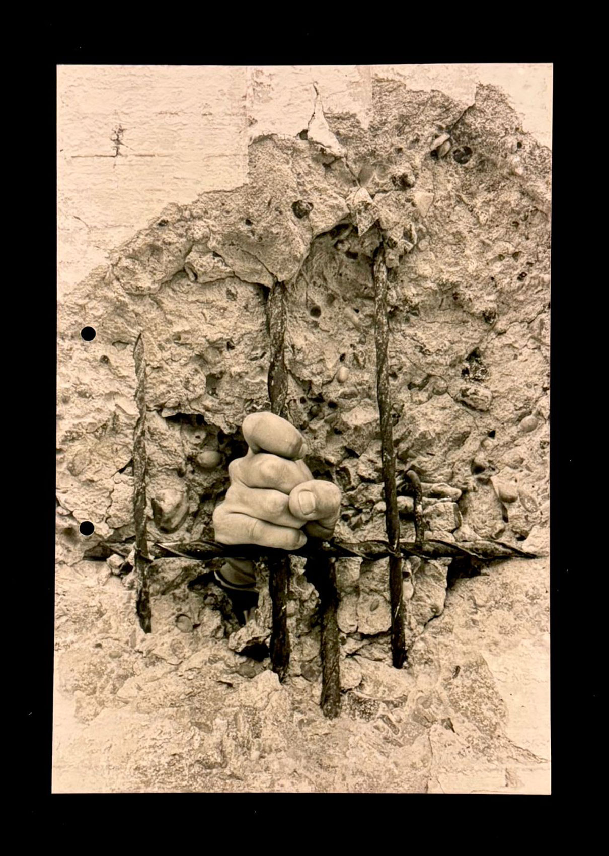 La mano que emerge entre las varillas de acero expone el límite físico de ese sistema y, al mismo tiempo, el impulso de permanecer visible aun dentro de la coerción.